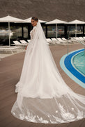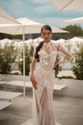 The "Adeline" wedding dress from the TANYA GRID collection showcases intricate floral lace, a high neckline, and sheer sleeves for timeless elegance. The daring slit and fitted silhouette create a modern, sophisticated look for the contemporary bride.