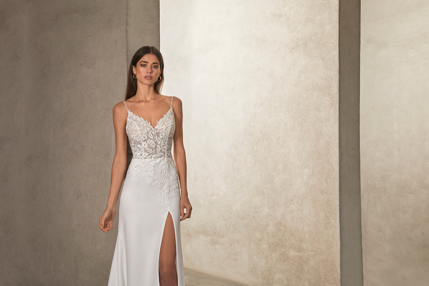 This dress from the TIMELESS collection combines modern elegance with classic allure, featuring a draped satin silhouette, a lace bodice with intricate floral details, and sheer lace gloves. Perfect for a bride seeking sophistication and understated glamour.