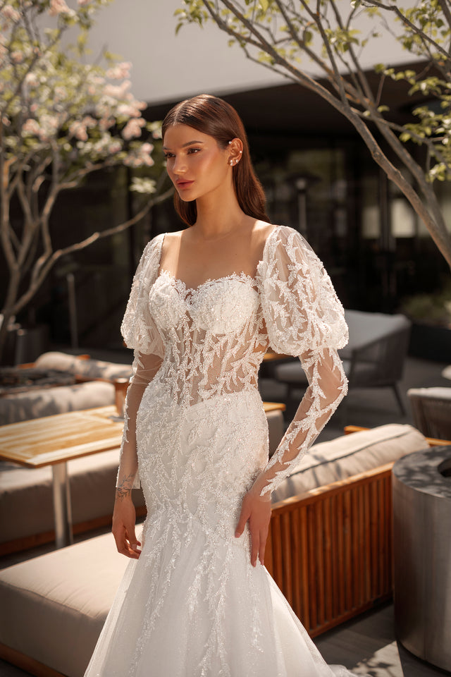 A stunning long-sleeve wedding gown with intricate lace detailing, a high neckline, and a subtly shaped bodice that transitions into a flowing tulle skirt. The combination of vintage-inspired lace patterns and a contemporary silhouette creates an elegant and sophisticated bridal look, perfect for any season.