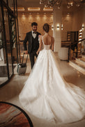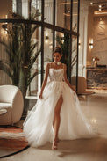 This dress from the TIMELESS collection features an elegant floral lace bodice with delicate straps, a flowing tulle overlay, and intricate embroidery. Its classic design radiates sophistication, perfect for a modern bride seeking a blend of romance and timeless charm.