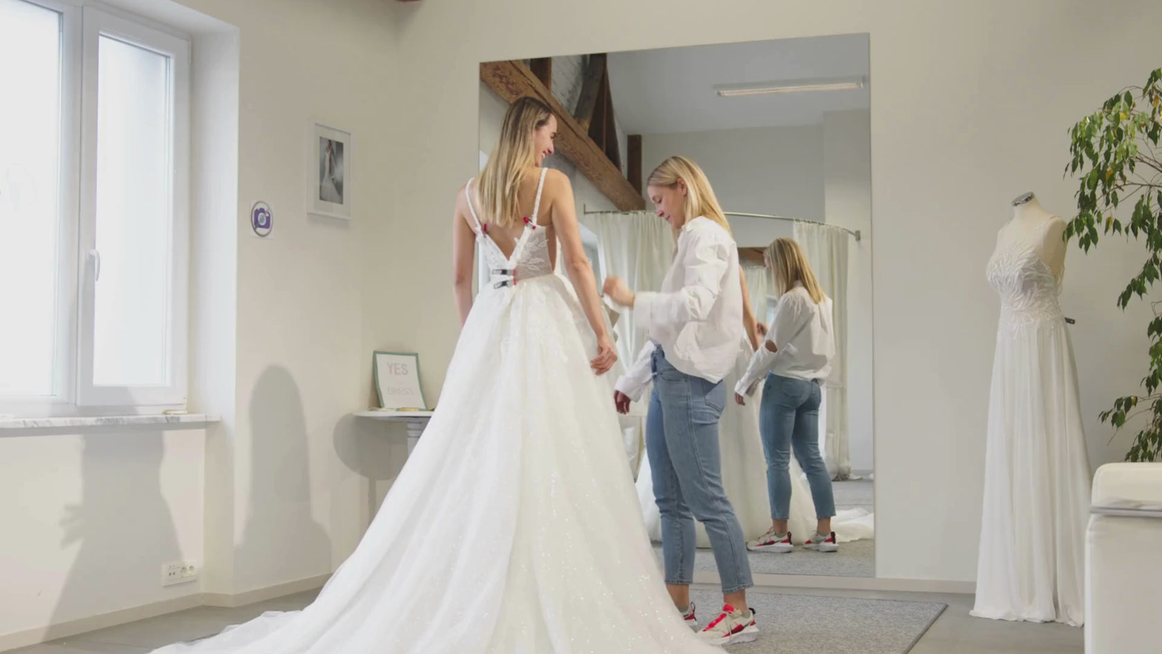 As you try on dresses, your stylist makes minor adjustments to help you envision the perfect fit. Together, you discuss possible alterations and receive styling tips for accessories.