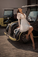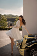 The "AMELIE" wedding dress from the TANYA GRID collection features shimmering beadwork, sheer long sleeves, and a plunging neckline, combining glamour and elegance for a show-stopping bridal look.