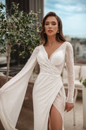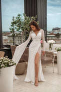 This dress from the TIMELESS collection exudes modern elegance, featuring a shimmering fabric, a wrap-style bodice with intricate beadwork, and flowing bell sleeves. Its sophisticated silhouette is designed for the bride who seeks a timeless yet bold statement.